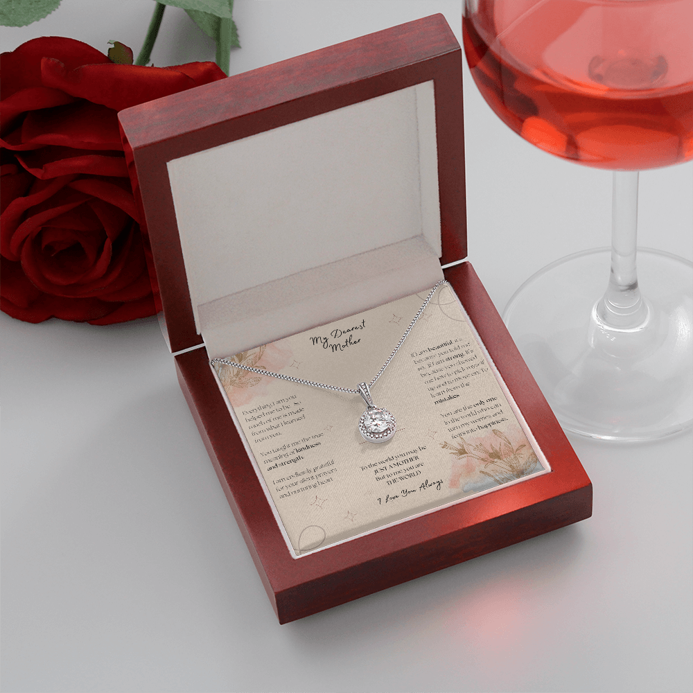 Upgrade to our luxury mahogany gift box featuring a built-in LED spotlight that illuminates the necklace when opened, creating a breathtaking presentation she’ll never forget.