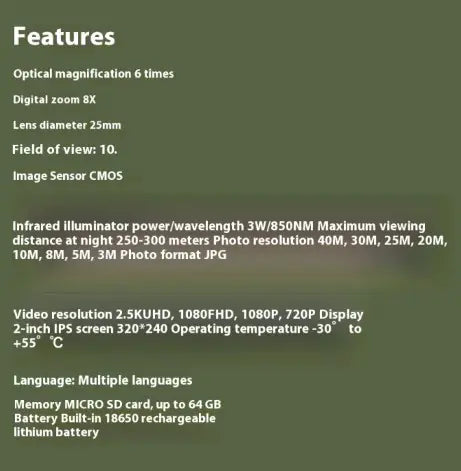 Infrared Night Vision: Full-color imaging in low-light conditions, perfect for nighttime use.